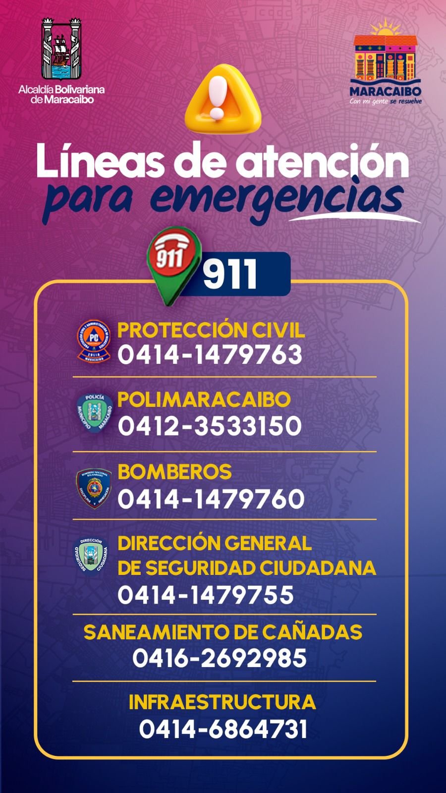 Protección Civil: 0414-1479763/Polimaracaibo: 0414-3533150/Bomberos: 0414-1479760/Dirección General de Seguridad Ciudadana: 0414-1479755/Saneamiento de Cañadas: 0416-2692985/Infraestructura: 0414-6864731.