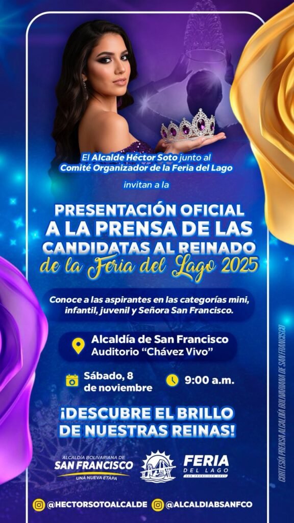 ENTRE TORMENTAS. La Alcaldía de San Francisco realizará este sábado 8 de noviembre, desde el Auditorio “Chávez Vivo”, la presentación oficial de las candidatas al reinado de la Feria del Lago 2025, evento central de las festividades que se desarrollarán los días 13 y 14 de noviembre en el Boulevard Virgen de Coromoto.