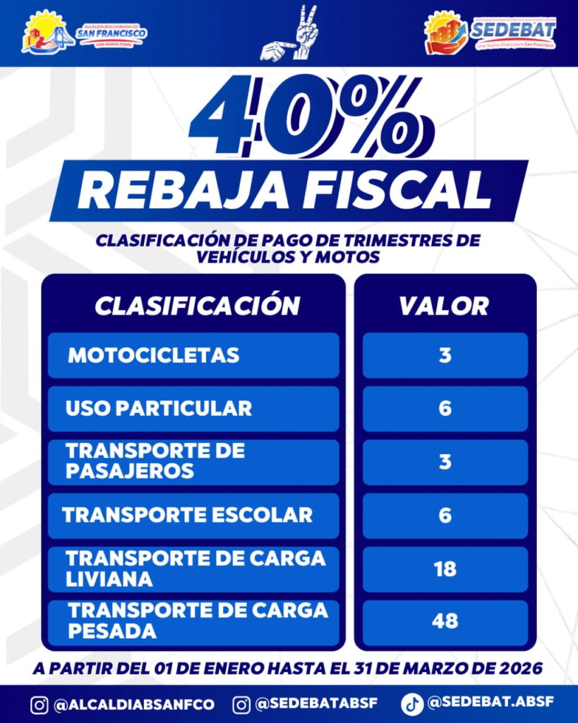 La jornada especial de pago del impuesto sobre vehículos y motos, dirigida exclusivamente al transporte público, se llevará a cabo desde el 7 de enero hasta el 31 de marzo de 2026, en las instalaciones del Terminal de Pasajeros Simón Bolívar, ubicado en la avenida 5 del municipio San Francisco.