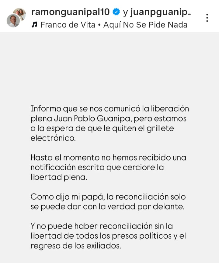 El mayor de los hijos de Juan Pablo Guanipa publicó sobre la medida en un mensaje corto: “Informo que se nos comunicó la liberación plena de Juan Pablo Guanipa, pero estamos a la espera de que le quiten el grillete electrónico. Hasta el momento no hemos recibido una notificación escrita que cerciore la libertad plena. Como dijo mi papá, la reconciliación sólo se puede dar con la verdad por delante”, expresó en el mensaje.