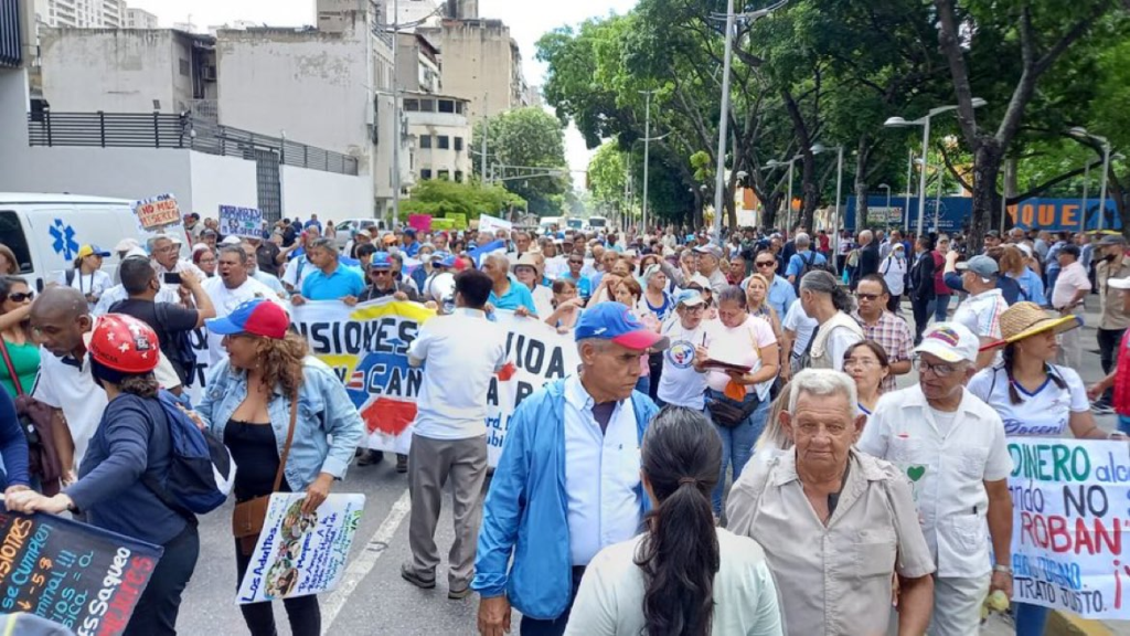 ENTRE TORMENTAS. La marcha de trabajadores y sindicalistas salió este jueves desde Plaza Venezuela con destino al centro de Caracas, acompañada de otros gremios como pensionados y estudiantes, que tiene como destino llegar a las cercanías del palacio de Miraflores.
