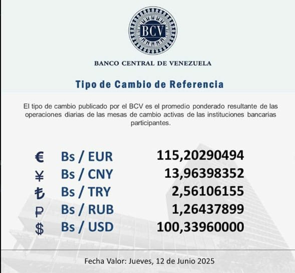 Vale destacar que el tipo de cambio publicado por el BCV es el promedio ponderado de las operaciones de las instituciones bancarias del país, al cierre de la jornada del miércoles 11 de junio de 2025.