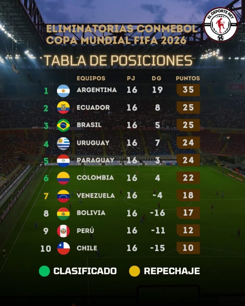 La Selección de Ecuador igualó 0-0 con Perú en el Estadio Nacional de Lima y consiguió la clasificación para el Mundial 2026. Los ecuatorianos accedieron a su quinta Copa del Mundo. Por su parte, Perú está virtualmente eliminada ya que queda a seis puntos (con seis en disputa) de Venezuela (18), que por ahora está en posición de Repechaje.